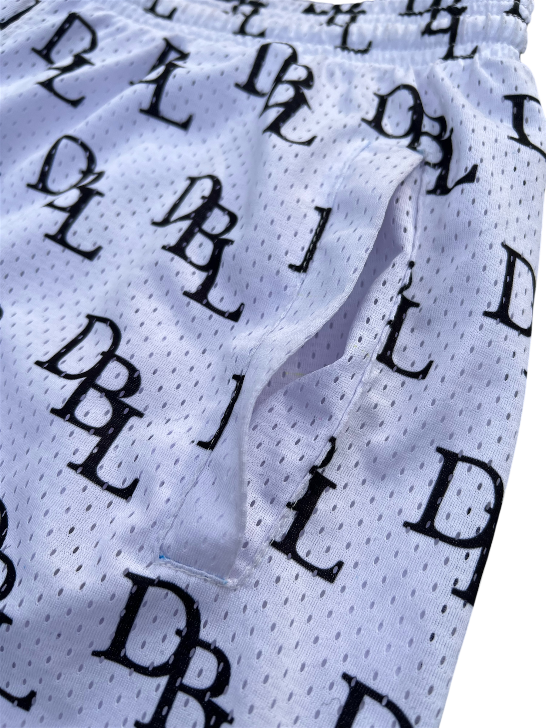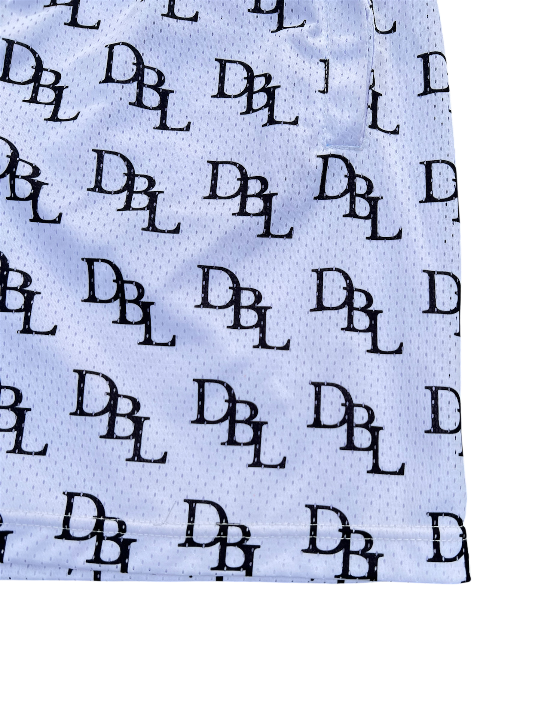 A crisp white base covered in black DBL logos brings the message loud, while a 6" inseam delivers the perfect balance of mobility and street-ready style.